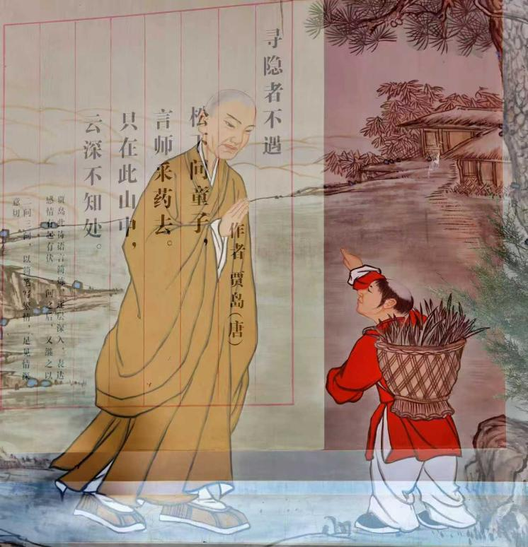贾岛的衣袂浸在书院的柔光里,像一页被岁月晕染的旧诗笺——淡得几乎要融进墙侧的窗影,却把“僧敲月下门”的余味,轻轻落在了桌角的茶烟里。
